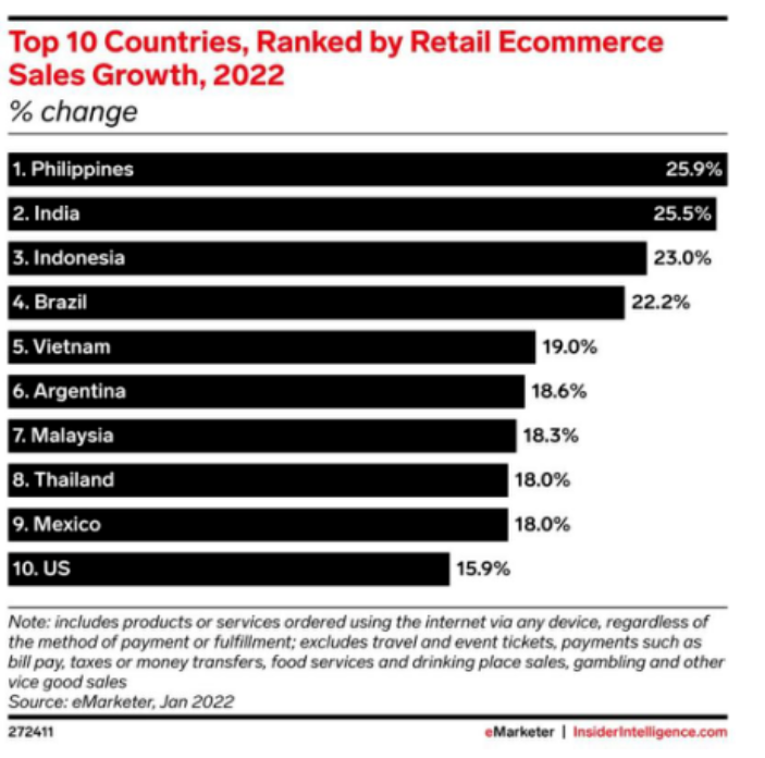 市場研究機(jī)構(gòu)eMarketer 日前發(fā)布報(bào)告預(yù)計(jì),2022年,全球電商增速排名前十的國家中,東南亞地區(qū)占據(jù)一半,分別為排名前三的新加坡(36%)、印尼(34%)和菲律賓(25.9%),排名第七的馬來西亞(18.3%)和第八的泰國(18%)。