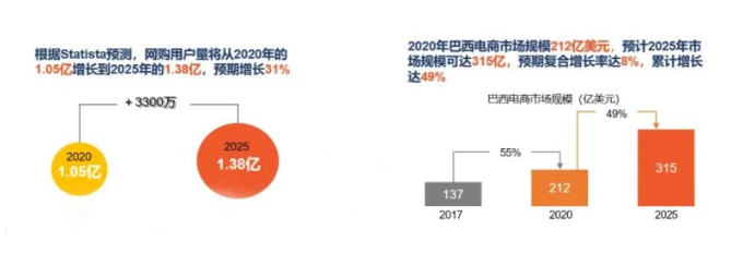 其中,巴西電商現(xiàn)狀表現(xiàn)為電商用戶數(shù)量及花費(fèi)持續(xù)增加。根據(jù)Statista預(yù)測,巴西網(wǎng)購用戶量至2025年將增長31%,高達(dá)1.38億;預(yù)計(jì)市場規(guī)??蛇_(dá)315億美元,累計(jì)增長49%。