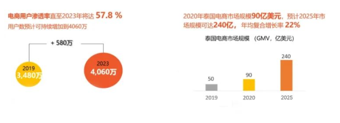 而泰國作為東南亞第二大經(jīng)濟(jì)體,泰國電商用戶滲透率至2023年將達(dá)57.8%,預(yù)計(jì)2025年市場規(guī)模可達(dá)240億美元,年均復(fù)合增長率22%。