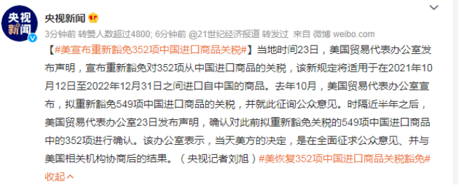 美國貿(mào)易代表辦公室(USTR)發(fā)表聲明,宣布重新豁免對352項從中國進口商品的關(guān)稅,該新規(guī)定將適用于在2021年10月12日至2022年12月31日之間進口自中國的商品。